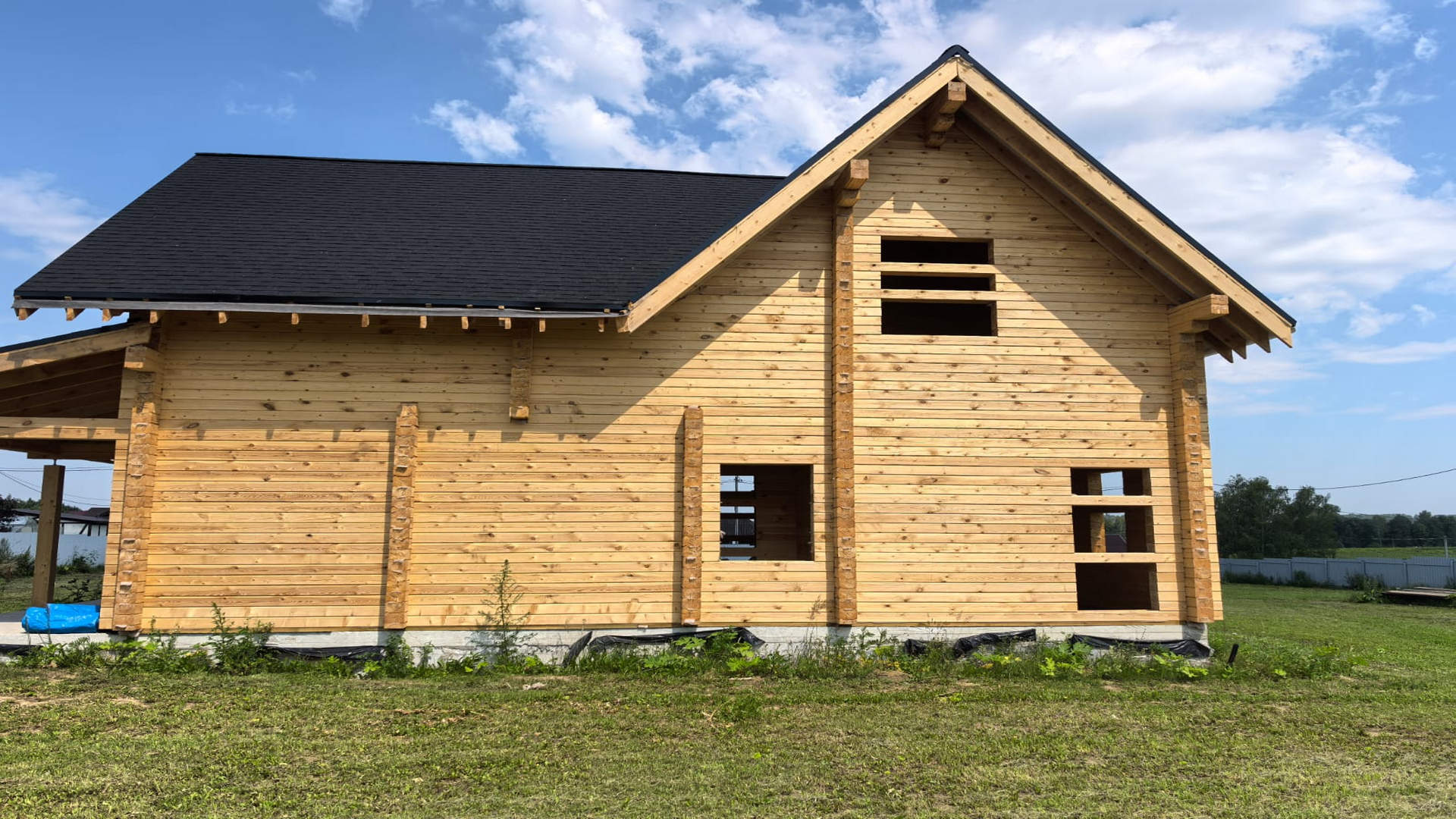 И, конечно же, завершающим аккордом стала кровля. Она выполнена из гибкой черепицы, которая не только обеспечивает надёжную защиту от любых капризов погоды, но и придаёт всему дому поистине изысканный и благородный вид. Мягкие линии и глубокие оттенки черепицы гармонично сочетаются с натуральным деревом, создавая неповторимый облик, который будет радовать глаз многие годы.